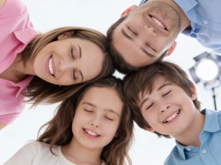 Семейное фото "лица" в студийном стиле передает близость через крупный план: лбы соприкасаются, глаза закрыты, улыбки спокойные и искренние. Минималистичный белый фон убирает лишнее и усиливает эмоцию, оставляя в кадре только самое важное.