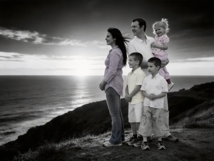 Семейная фотография боком на берегу моря передает редкое ощущение единства: фигуры выстроены в профиль на холме, а океан и закат превращают кадр в выразительные силуэты. Контровое освещение усиливает объем и подчеркивает жесты, а ветер в волосах добавляет живой динамики без постановочности.
