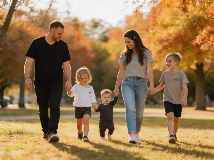 Семейное фото с детьми в осеннем парке передает живые эмоции прогулки: родители и дети держатся за руки, а золотая листва создает уютный фон. В основе результата лежит промпт с указанием мягкого бокового освещения и теплой цветовой гаммы, которые делают кадр естественным и кинематографичным.