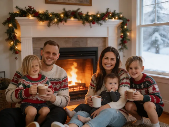 Семейная открытка родителей и детей у камина передает тихую радость зимнего вечера: улыбки, какао в кружках, гирлянда и снег за окном создают узнаваемую новогоднюю атмосферу, которую хочется сохранить.
