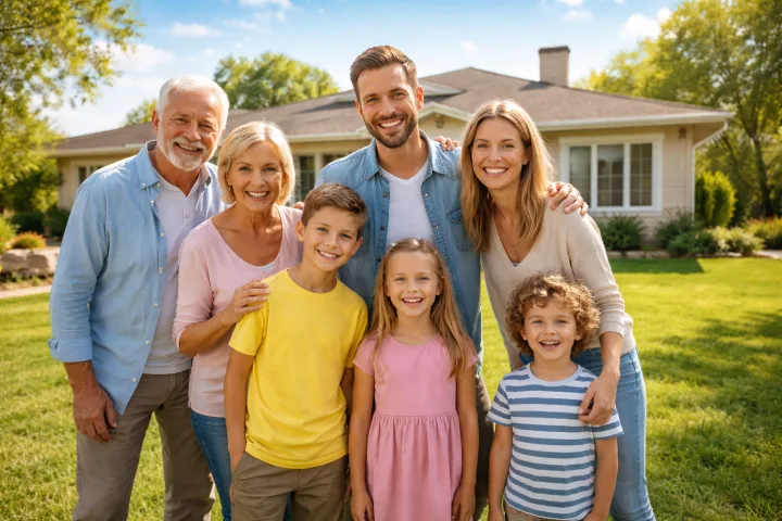 Солнечная погода, голубое небо и зеленая лужайка перед одноэтажным домом дают мягкий естественный свет и чистые цвета. Лица читаются ясно, а фон добавляет ощущение уюта и стабильности.