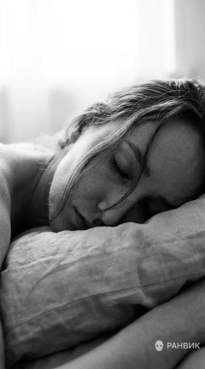 Фото раскрывает интимность черно-белого портрета: спящая женщина, лицо в смятой льняной подушке, пряди волос на щеке. Мягкий рассеянный утренний свет из окна строит плавный переход от чистого белого к глубокому черному, сохраняя выразительность фактуры кожи и хлопка.