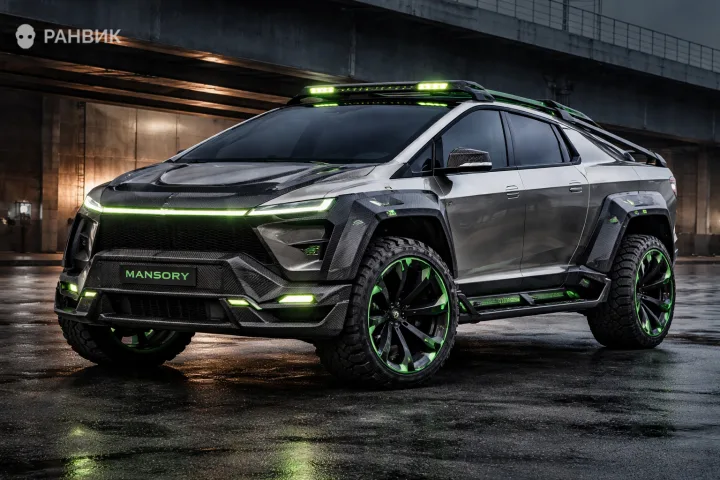 Агрессивный обвес из карбона, расширенные колесные арки и огромные внедорожные колеса с зелеными акцентами создают ощущение силы и сцепления. Неоновая зеленая подсветка спереди и по кузову работает как визуальный каркас, делая силуэт читаемым издалека.