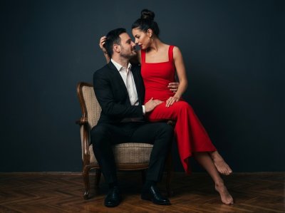 Мягкий софтбокс сверху и сбоку с эффектом создает глубокие тени и чистые блики, сохраняя естественную фактуру кожи. Оптика с характером 85 мм и малая глубина резкости (f/2–2.8) удерживают фокус на лицах и руках, а цветовая коррекция делает красный акцент платья выразительным, без перегруза.