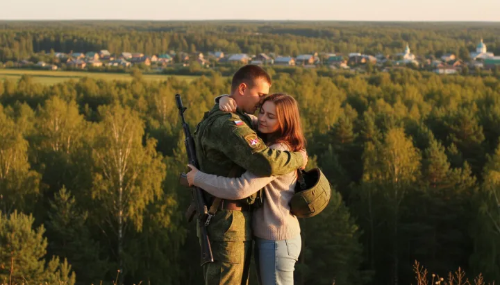 Фото жены военного со своим возлюбленным передает тихую близость и поддержку: молодая женщина обнимает солдата в форме, а вокруг раскрывается просторный пейзаж. Теплая, нежная атмосфера читается в позах и взглядах, создавая ощущение защищенности и доверия.