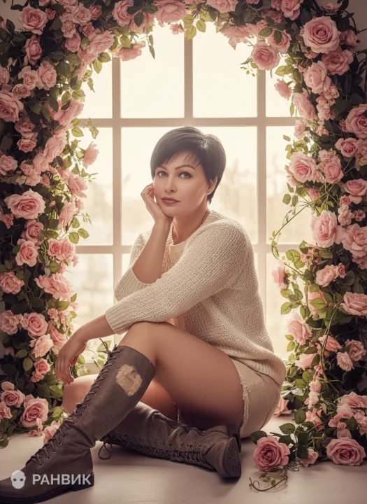 Портретная сцена, где пастельная палитра и садовая арка из роз собирают внимание вокруг героини и задают мягкое, кинематографичное настроение. Вертикальный кадр с акцентом на позу - согнутые колени и руки у щеки - работает как готовая композиция для обложки, афиши или серии в едином стиле.