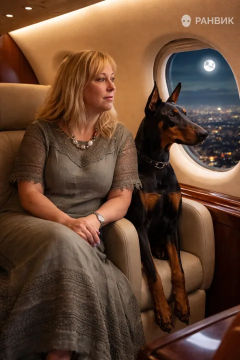 Фотореалистичная сцена в салоне частного самолета: элегантная женщина и черныи доберман в тишине смотрят в иллюминатор, где мерцают ночной город и луна. Мягкий теплый свет внутри подчеркивает фактуру материалов и создает ощущение камерной роскоши.