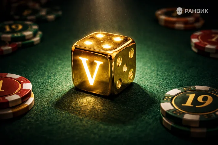Чистое золото на зеленом сукне, вокруг фишки с числами 1, 9 и 19. В центре внимания - верхняя грань, где вместо точки светится римская цифра V, задавая настроение финального броска и подчеркивая тему судьбы.