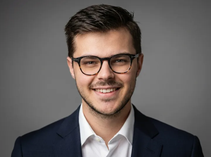 Гиперреалистичная фотография портрет крупным планом головы профессионального сотрудника: четкие черты лица, аккуратная короткая стрижка, (тонкий макияж, если это женщина) на нейтральном сером студийном фоне. сотрудник одет в официальный костюм с белоснежной рубашкой. Уверенный прямой взгляд в камеру, теплая улыбка, естественная текстура кожи и освещение. Снято камерой Nikon Z7 II, объективом 85 мм, диафрагмой f/1,8, высоким динамическим диапазоном, с высокой детализацией глаз, черт лица и ткани, фотореалистично, разрешение 8K, четкая фокусировка на лице, минимальная глубина резкости для легкого размытия фона, стиль корпоративного портрета.