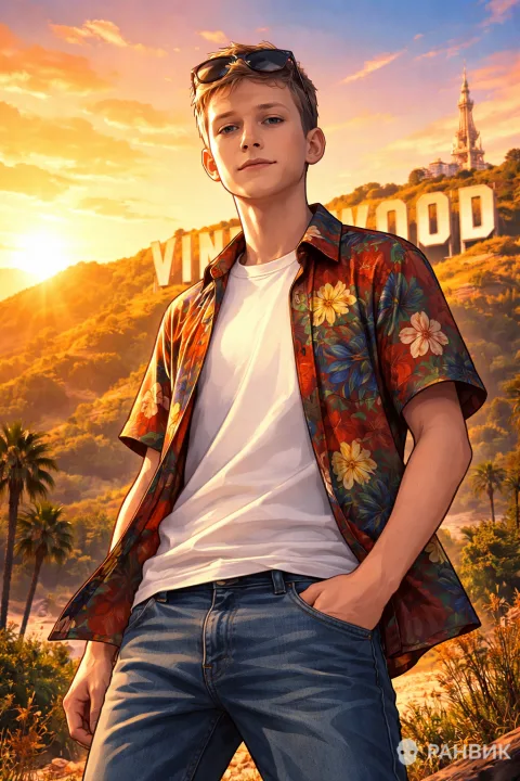 Легкая стилизация под цифровую живопись сохраняет реалистичную детализацию лица и узнаваемые черты, добавляя при этом плакатную выразительность. Одежда считывается мгновенно: расстегнутая гавайская рубашка, очки на голове, джинсы - идеальный образ для жаркого заката.