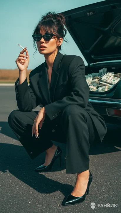 Криминальное настроение поддерживают очки, сигарета, длинный френч и лаковые лодочки на шпильке. В ретуши - насыщенные зеленые тона машины, теплые натуральные оттенки кожи, легкая пленочная зернистость и виньетка: сохраните эти ориентиры в промпт, чтобы стабильно получать высокую контрастность.