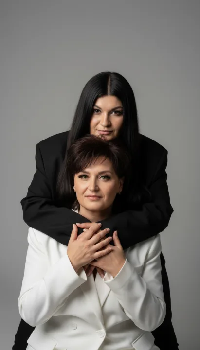 Мама и дочка показаны через сдержанный жест: мягкие объятия за плечи и спокойный взгляд в кадр. Нейтральный серый фон и минимализм убирают лишнее, оставляя главное - близость и поддержку.