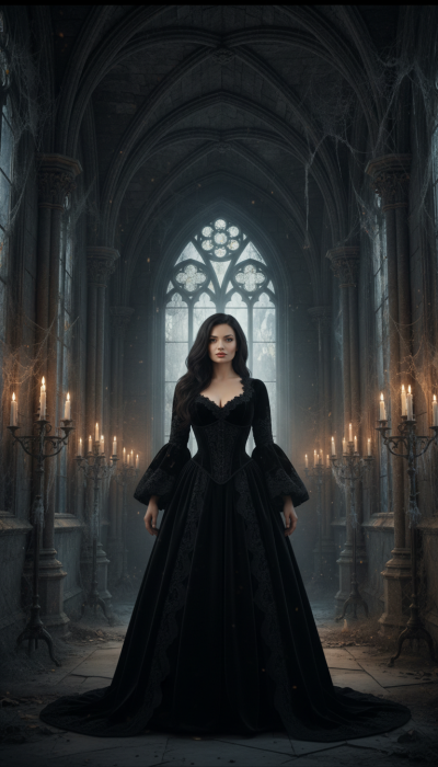 Черное платье с корсетом, бархат и кружево читаются благодаря высокой детализации кожи и ткани, реалистичным текстурам и аккуратной глубине резкости. Промпт также задает кинематографичный свет и объемный воздух, поэтому зал замка с колоннами, пылью и паутиной выглядит правдоподобно и цельно.