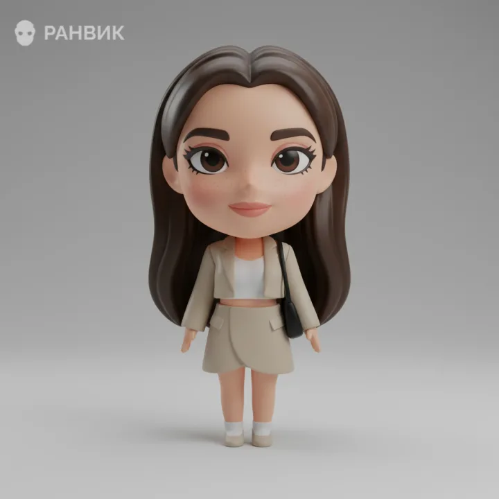 Игрушка по фото девушки в стиле чиби превращает портрет в коллекционную 3D фигурку с выразительным лицом и стилизованными пропорциями: большая голова, компактное тело, аккуратная стоячая поза. В кадре считывается точный наряд и настроение, а образ выглядит уместно и для витрины, и для подарка.
