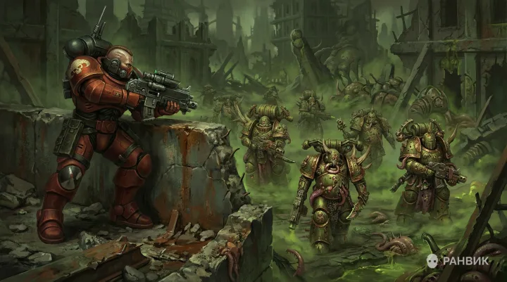 Иллюстрация Вархаммер 40к Орден экзорцистов передает столкновение авангарда Экзорцистов с Чумными десантниками гвардии смерти в руинах мертвого города. Масcивная красная броня и тяжелая винтовка читаются сразу, а токсичный туман и грязь усиливают ощущение обреченности и напряжения.