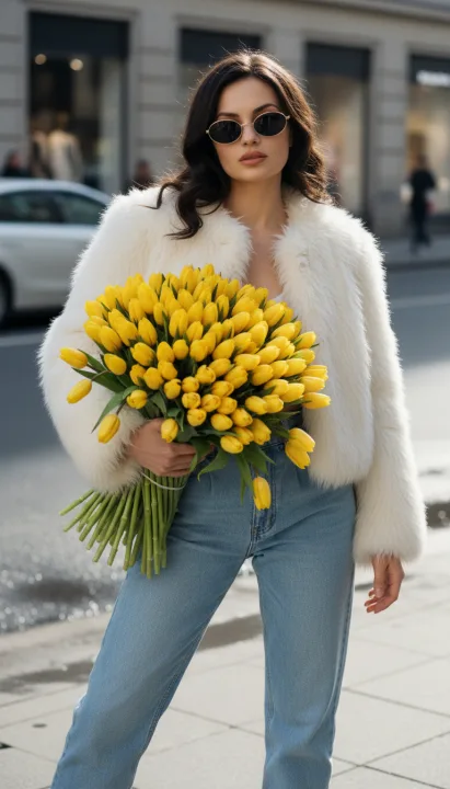 Поза с переносом веса на одну ногу и крупная нижняя доминанта из цветов усиливают динамику. Черные овальные очки в тонкой золотистой оправе и белая куртка из искусственного меха создают модный силуэт. Если нужен повторяемый результат, сохраняйте промпт со светом и фактурой, а затем уточняйте его под локацию и сезонные оттенки.
