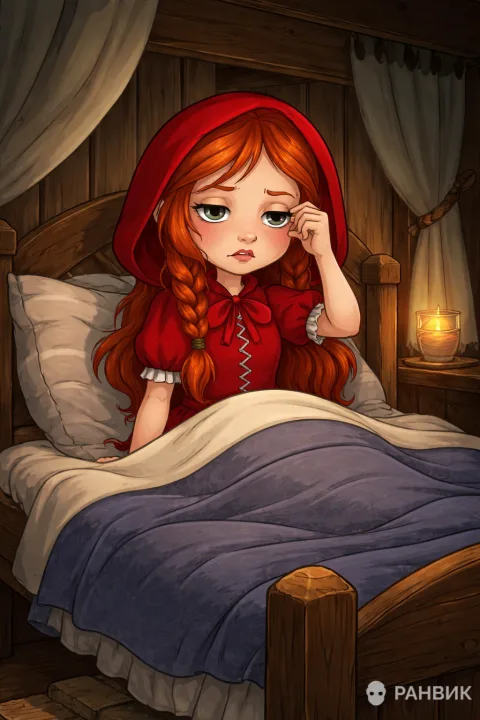 Картинка показывает сказочную героиню в момент пробуждения: рыжие косы, красный капюшон и сонный взгляд в деревянной кровати с резными спинками. В кадре ощущается камерность и тишина, а внимание удерживает выражение лица и мягкая поза по пояс в постели.