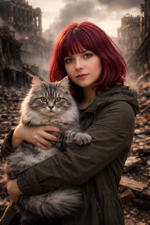 История про хрупкую нежность среди руин: женщина с малиновыми волосами прижимает к себе серого пушистого сибирского кота на фоне разрушенного города. Контраст теплых тонов лица и холодной пыли вокруг усиливает драму и делает кадр запоминающимся.
