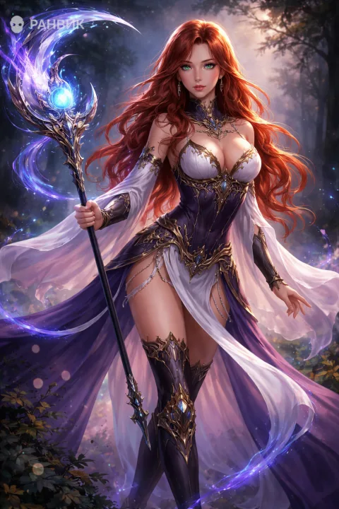 Картинка девушки-мага в стиле аниме с посохом раскрывает героиню фэнтези с длинными рыжими волосами и светящимися голубыми глазами. Синяя энергия на посохе, искры и световые завитки создают яркую волшебную атмосферу, а таинственный лес усиливает ощущение приключения.