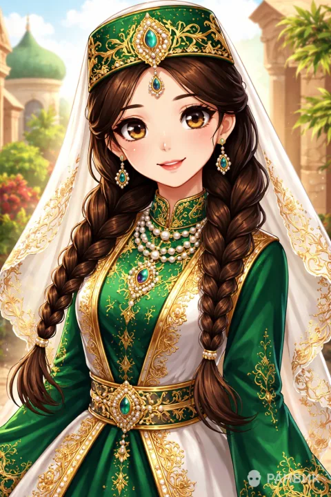 Картинка девушки татарки в национальной костюме в стиле аниме раскрывает утонченный образ казанской татарки: зеленый наряд с золотой вышивкой, богатые украшения и белая вуаль создают ощущение торжественности и тепла.