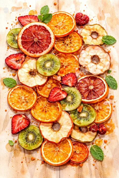Акварельная композиция с видом сверху показывает россыпь фруктовых чипсов на фактурной деревянной поверхности: яблоки, киви, апельсины и бананы складываются в яркую, аппетитную палитру. Мягкий свет подчеркивает прозрачность долек, а зернистость бумаги и характерное растекание акварели добавляют живую ручную выразительность.