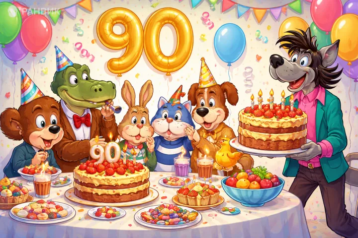 Иллюстрация передает праздничный размах и теплую атмосферу: знакомые персонажи за общим столом, большой торт со свечами, конфетти и гирлянды, а на фоне - золотые воздушные шары с цифрой 90. Такой сюжет легко превращается в открытку, афишу или заставку для семейного праздника, где важны настроение и узнаваемые образы.