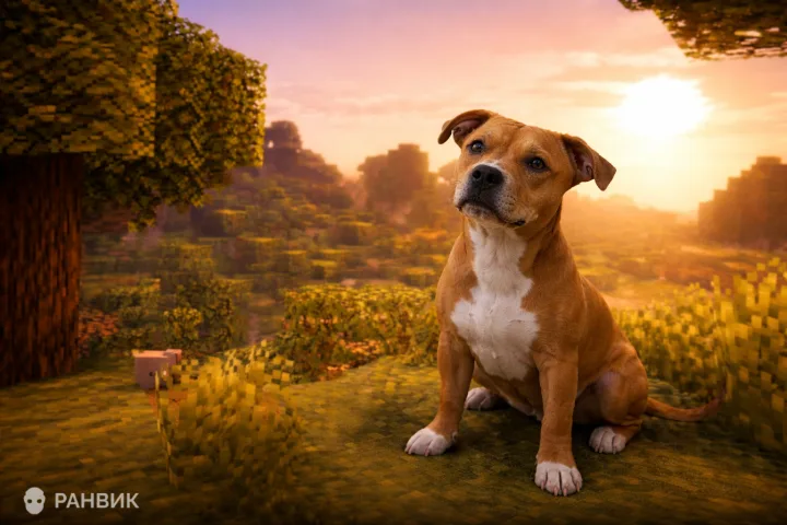 Картинка настоящей собаки в мире Minecraft показывает реалистичного питбуля среди кубических деревьев и пиксельного пейзажа, где стилизованная среда подчеркивает характер и пластику животного. Контраст фактур помогает увидеть, как совместить правдоподобие и игровую условность без потери выразительности.