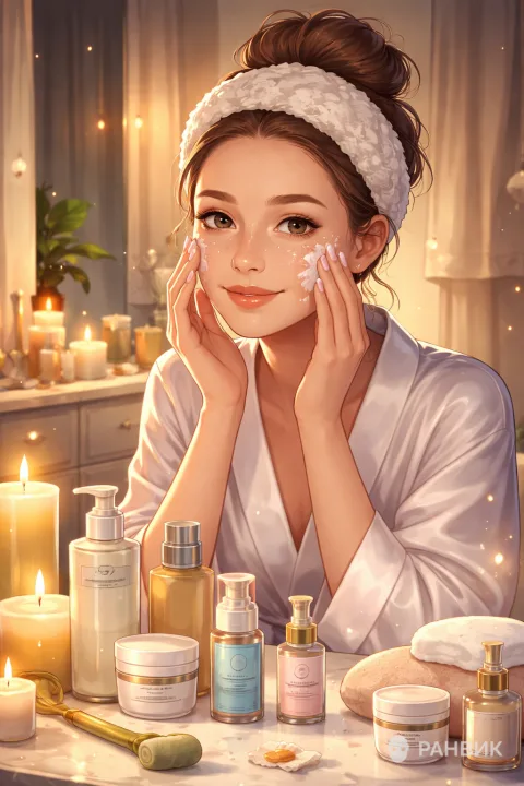 Иллюстрация ухода за собой в аниме стиле передает эстетику бьюти-вечера: портрет 2:3, героиня по центру и по пояс, руки у лица, а вокруг - аккуратно расставленные средства. Объемное освещение и теплая бежевая палитра делают кожу сияющей, а глубина резкости мягко отделяет планы, усиливая ощущение чистоты и уюта.