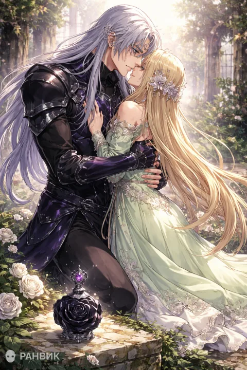 Длинные серебряные волосы героя и серебряные цветы в волосах героини связывают персонажей визуально, а мягкий свет и природный фон добавляют глубины и воздуха. У ног пары стоит черный флакон духов в форме розы: точный символ, который усиливает тему памяти и притяжения.