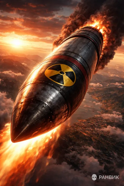 Картинка ядерной бомбы в небе крупным планом показывает предельное напряжение кадра: кинематографичный ракурс, резкий фокус и высокий контраст усиливают ощущение скорости. Закатное оранжево-красное освещение подчеркивает обьем и фактуру, а густой черный дым формирует выразительную траекторию движения.