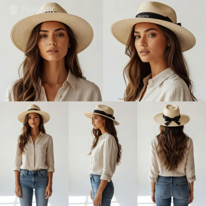 Коллаж из фото девушки в панаме на белом фоне показывает летний образ в чистой студийной подаче: светло-бежевая соломенная панама с широкими полями и черной лентой создает выразительный акцент и помогает удержать внимание на лице.