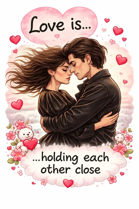 Романтическая открытка ко Дню влюбленных, созданная по задаче: сделать иллюстрацию в духе «Love is…» с узнаваемой композицией и теплым настроением. Мягкая пастельная палитра, воздушные облака и акцентные сердечки формируют нежный фон, а пара в объятиях становится эмоциональным центром кадра.
