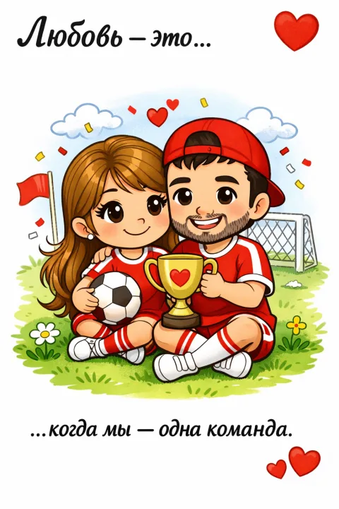 Открытка ко Дню влюбленных в духе «Love is…», где главная мысль звучит просто и точно: «…когда мы — одна команда». Иллюстрация выполнена в мультяшной манере с чистыми контурами и мягкими цветами: пара в спортивной форме, мяч, кубок и сердечки создают легкое, радостное настроение без лишних деталей.