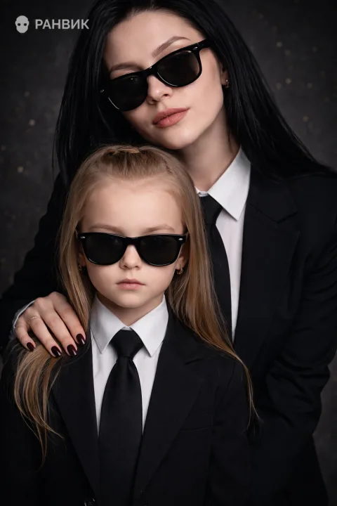Выразительная постановка, где женщина и девочка в черных пиджаках, белых рубашках и галстуках смотрят прямо и без лишних эмоций. Темные очки с затемненными линзами усиливают ощущение тайны, а близкий контакт - рука на плече и лица рядом - добавляет кадру доверие и внутреннюю силу.