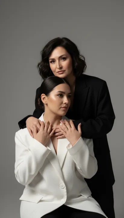 Ультра реалистичная фотосессия мамы с дочкой показывает, как в студии на нейтральном сером фоне можно передать близость без лишних деталей. Крупные планы по пояс, строгие оверсайз-пиджаки и аккуратные прически собирают внимание на взглядах и жестах, а не на декорациях.