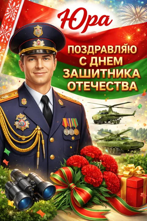 Открытка для поздравления с 23 февраля для майора милиции Республики Беларусь создана, как торжественный визуальный знак уважения: на фоне государственного флага размещена персональная надпись «Юра, поздравляю с днем защитника отечества», а композицию поддерживают праздничные салюты и подарочная символика.