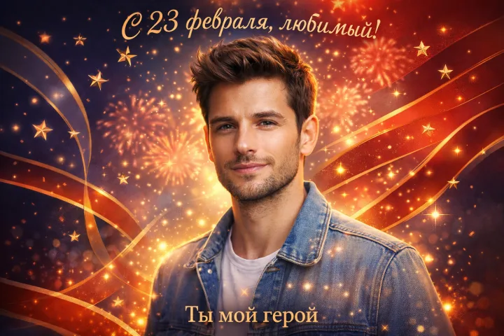 Персональная праздничная открытка, где главное - его узнаваемость, естественная улыбка и уверенная подача. Теплая, романтичная атмосфера помогает сказать важное: он мой защитник и моя опора.