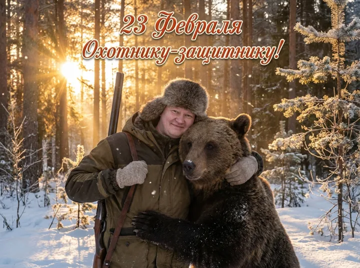 Зима и раннее утро передают настроение: первые лучи солнца пробиваются сквозь деревья, добавляют мягкое золотистое освещение и подчеркивают фактуру снега и меха. Праздничные надписи вверху по центру: «23 Февраля» и «Охотнику-защитнику!» удерживают баланс между торжественностью и приключенческим духом.
