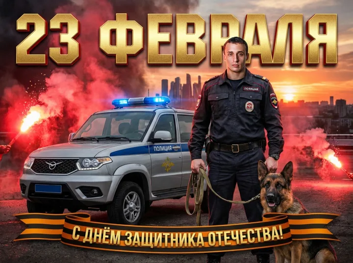 Праздничная открытка, которая смотрится, как афиша динамичного боевика: герой в современной форме полиции России рядом с немецкой овчаркой и служебным УАЗом. В композиции важна читаемость: крупная золотая надпись «23 Февраля» и поздравление на георгиевской ленте остаются четкими даже при уменьшении.