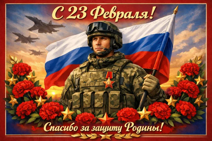 Открытка к 23 февраля выполнена в формате торжественной патриотической иллюстрации с акцентом на силу, мужество и уважение к защитникам Отечества. Общий тон сдержанный и героический, а базовый промпт задает направление на реалистичность и эмоциональную глубину сцены.