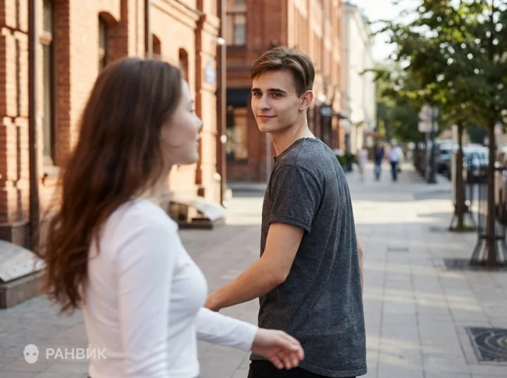 Промпт с парнем который смотрит на девушку задает живую уличную сцену: парень в рубашке идет и на ходу оборачивается на девушку, удерживая прямой взгляд и легкую улыбку. Такой прием мгновенно добавляет кадру интригу и ощущение движения, будто история продолжается за пределами снимка.