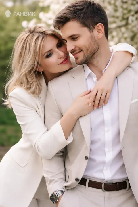 Красивое парное фото на фоне цветущих весенних деревьев помогает передать нежность без лишних слов: светлый костюм блондинки, белая рубашка и элегантные часы у мужчины создают чистый, праздничный образ. Мягкая улыбка, легкий наклон головы и объятие за плечи формируют живую эмоцию, а цветущая зелень добавляет кадру воздуха и романтики.