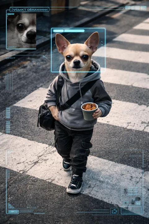 Преобразуй животное с прикреплённого изображения в ультрареалистичный 64K‑кадр с DSLR‑камеры в эстетике футуристического видеонаблюдения. Изобрази стильного персонажа, идущего по пешеходному переходу на асфальтовой дороге на задних лапах, максимально похоже на человека, снятого с высокой, слегка наклонённой CCTV‑точки. Атмосфера киберпанк‑стрит‑фото с цифровыми оверлеями (информационными блоками и надписями) системы наблюдения.