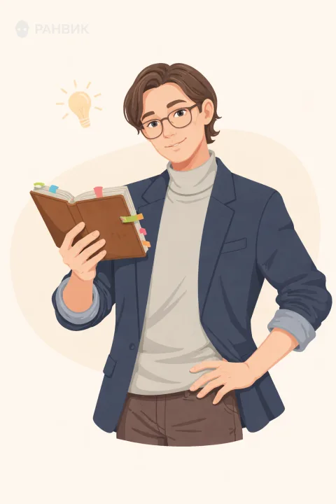 Смягченные тени и приглушенная палитра (серый, синий, бежевый) делают иллюстрацию аккуратной и «живой» без резких контуров. В руках - потертый кожаный блокнот с яркими закладками: знак структуры, заметок и рабочих инсайтов.