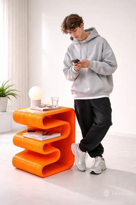 Глянцевая прикроватная тумба ярко-оранжевого цвета с волнообразным органическим силуэтом. В кадре важна не только идея, но и подача: чистые белые стены и светлый пол студии подчеркивают цвет и контраст.