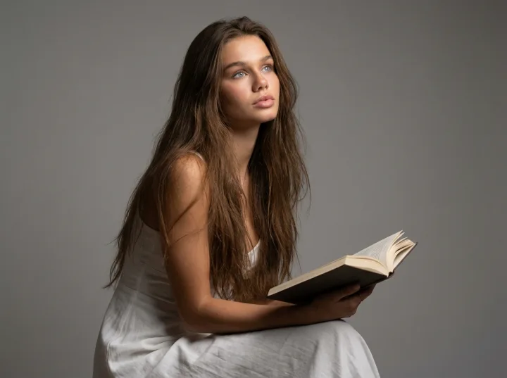 Нежный студийный портрет девушки в белом платье с книгой в руках передает атмосферу тишины, сосредоточенности и легкой задумчивости. Распущенные волосы, естественная поза и отрешенный взгляд создают ощущение личного момента, словно зритель застал героиню в минуты чтения и покоя.