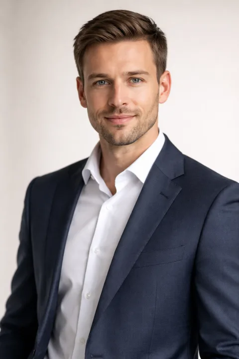 Деловое фото для профиля помогает сразу задать тон общению: уверенный образ, аккуратная подача, доверие с первого взгляда. Портрет по грудь на нейтральном светлом фоне подходит для резюме, корпоративных страниц, выступлений и переговоров.