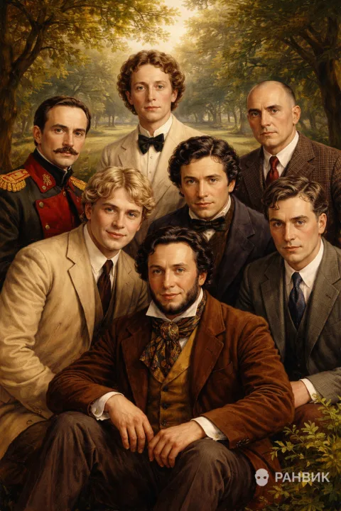 Портрет великих русских писателей и поэтов в парке соединяет поэтическую традицию и музейную живопись: парадная группа выстроена полукругом, а центр композиции удерживает сидящая фигура, как в аристократических полотнах XIX–XX века.