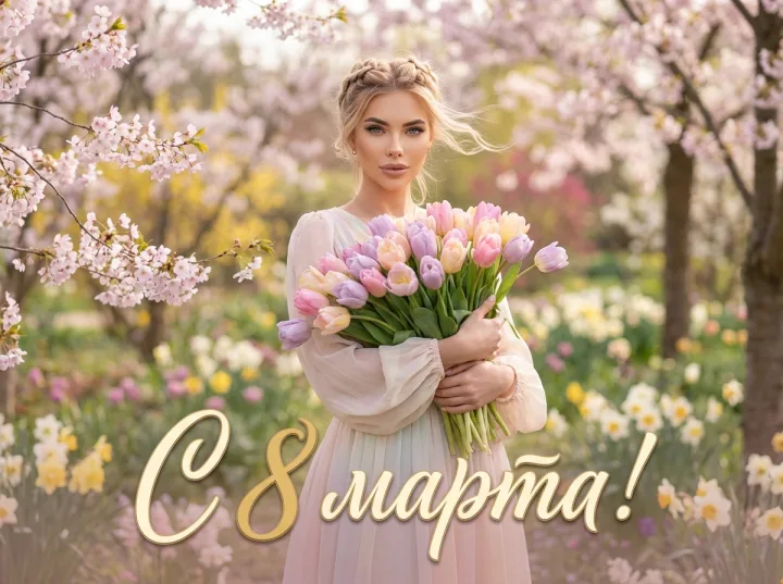 Поздравительная открытка на 8 марта в весеннем стиле создана для печати в горизонтальном формате: нежная композиция, пастельные тюльпаны и цветущий сад помогают передать теплое настроение праздника без лишних деталей.