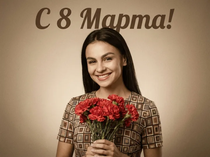 Советская открытка с 8 марта воссоздает атмосферу 1960-х: ретро-платье, букет гвоздик и теплая надпись «С 8 Марта!» в единой исторической эстетике. Цветные сепия тона вместе с зернистым эффектом дают узнаваемое «бумажное» настроение, близкое к печатной полиграфии СССР.